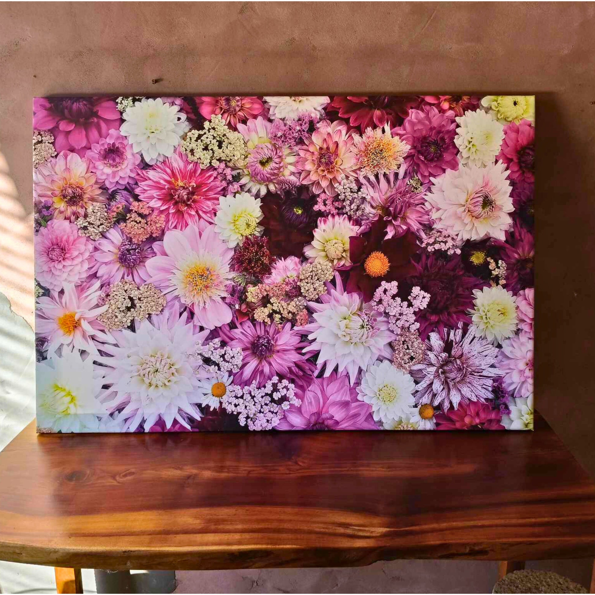 Create a lush, dreamy vibe with this beautiful large canvas artwork, celebrating the deep pinks and purples of Gracie-Mae’s one-of-a-kind dahlias.